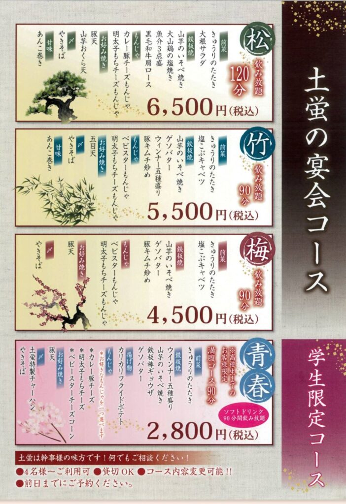 ゆったり楽しめる120分飲み放題付きの「松コース」は、鉄板焼きや黒毛和牛など贅沢な内容で、特別な集まりにぴったりです。気軽に楽しみたい方には「竹」「梅」コースもおすすめで、もんじゃやお好み焼きを中心にしっかり満足いただけます。